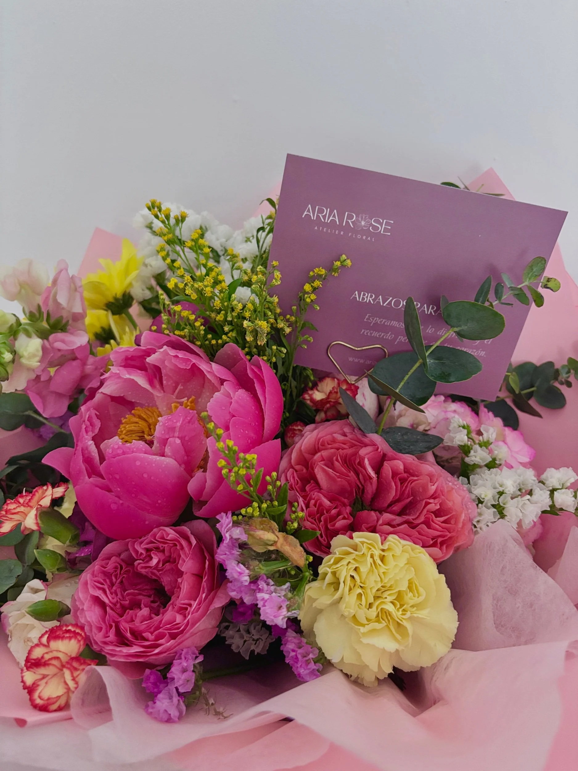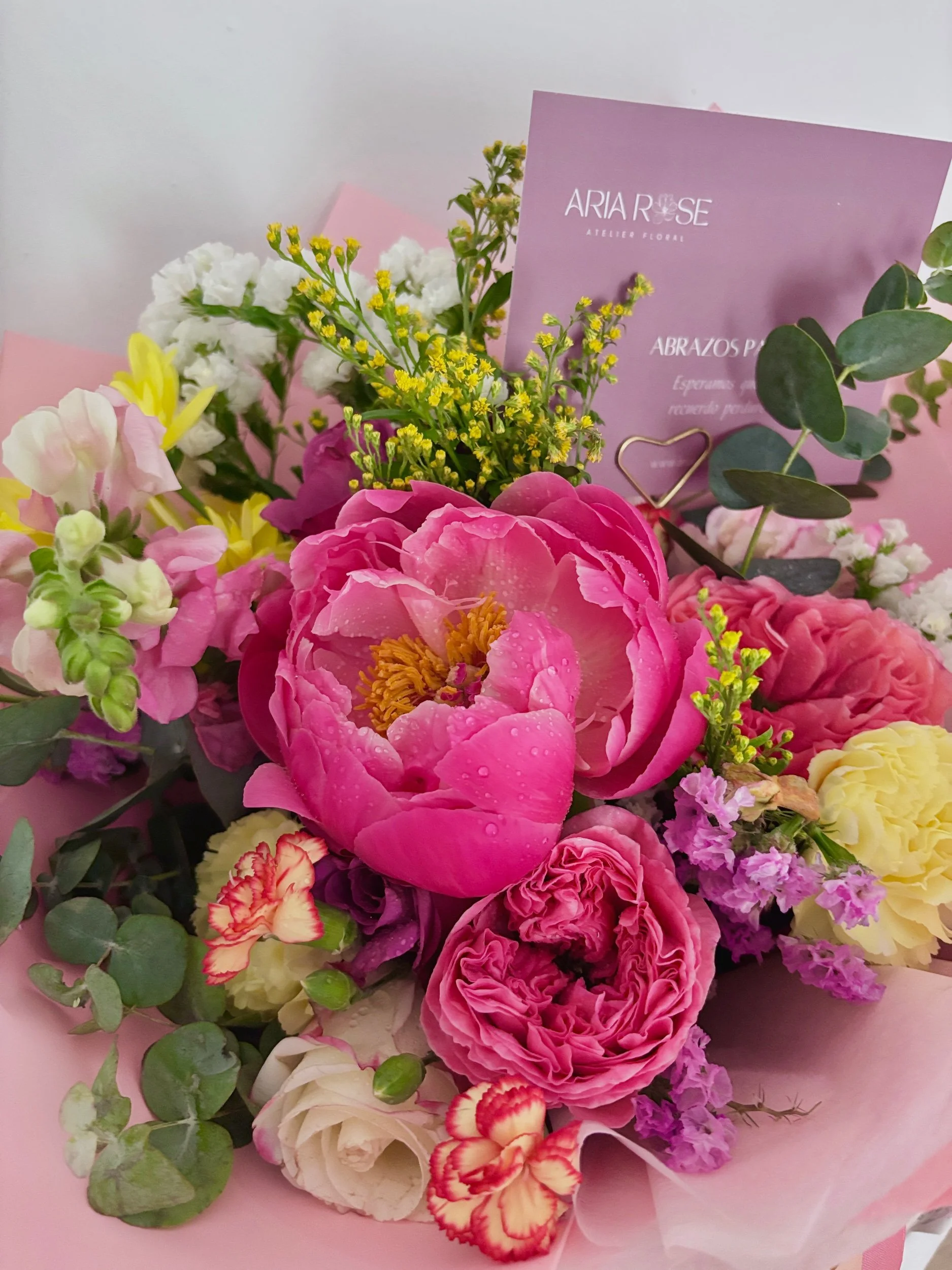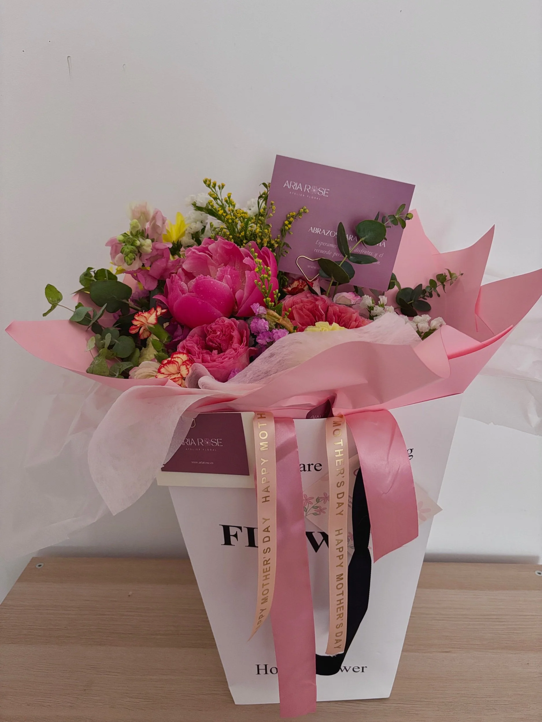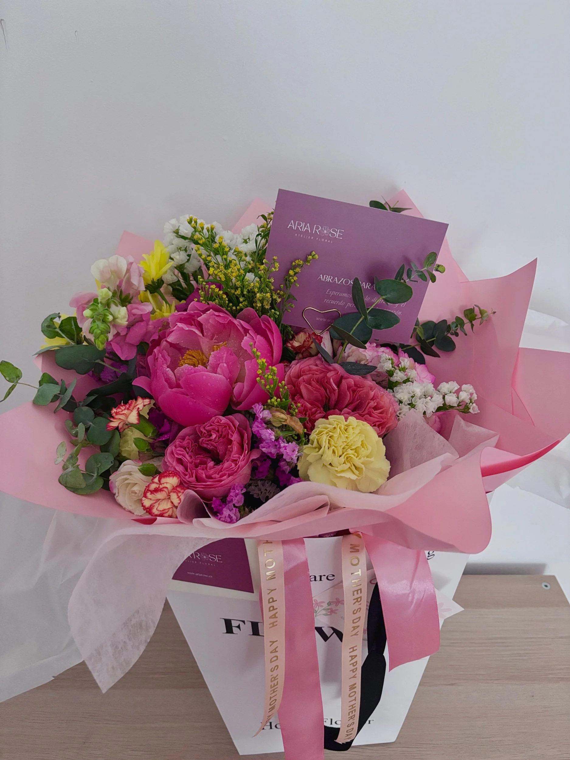 El bouquet destacó por su peonia fucsia de gran tamaño, rodeada de una exquisita selección de flores inglesas, claveles premium y otras variedades de temporada en tonos suaves y vibrantes. La composición, rica en texturas y matices, evocaba la belleza de los jardines primaverales y el calor de un abrazo maternal.