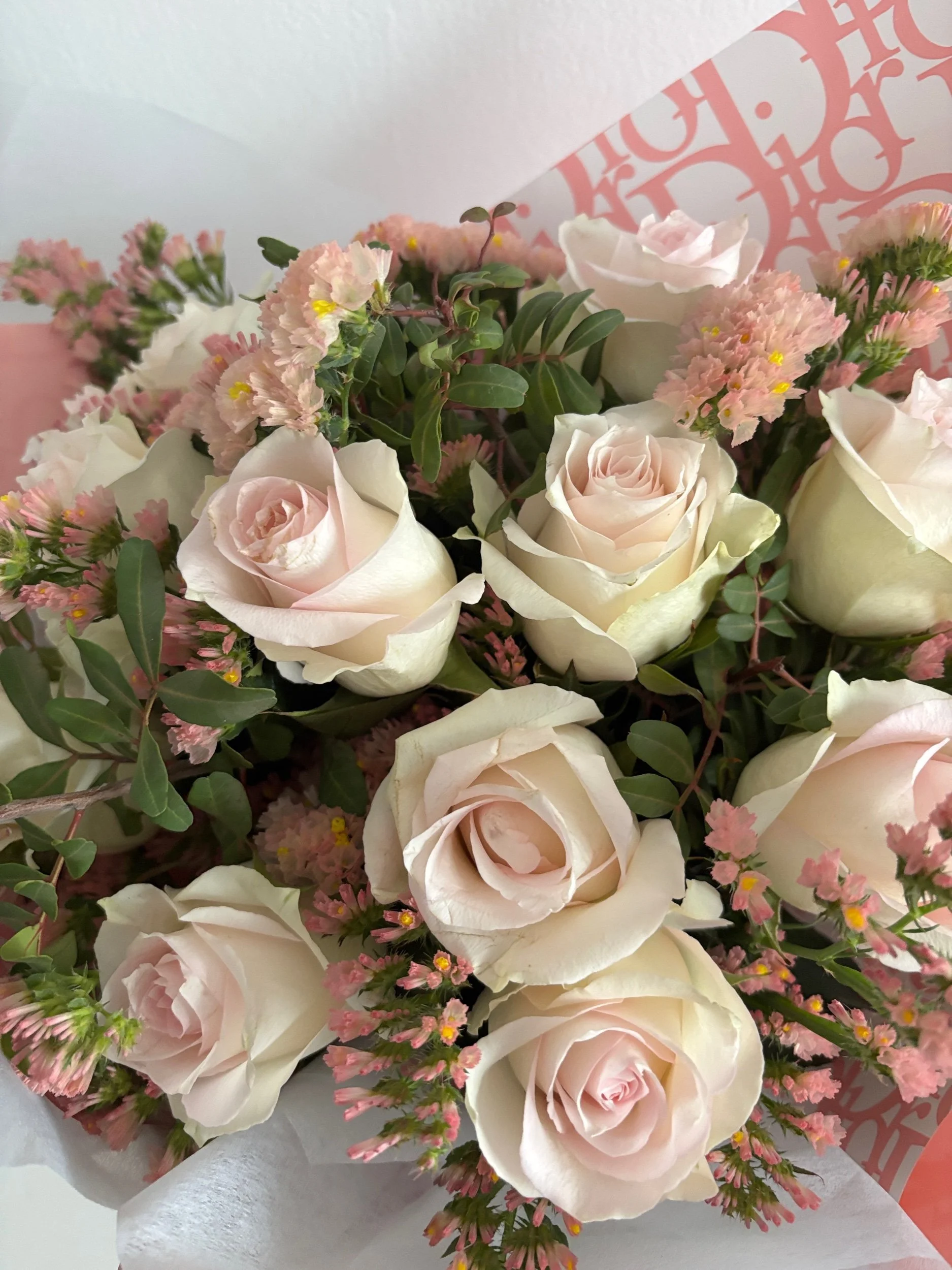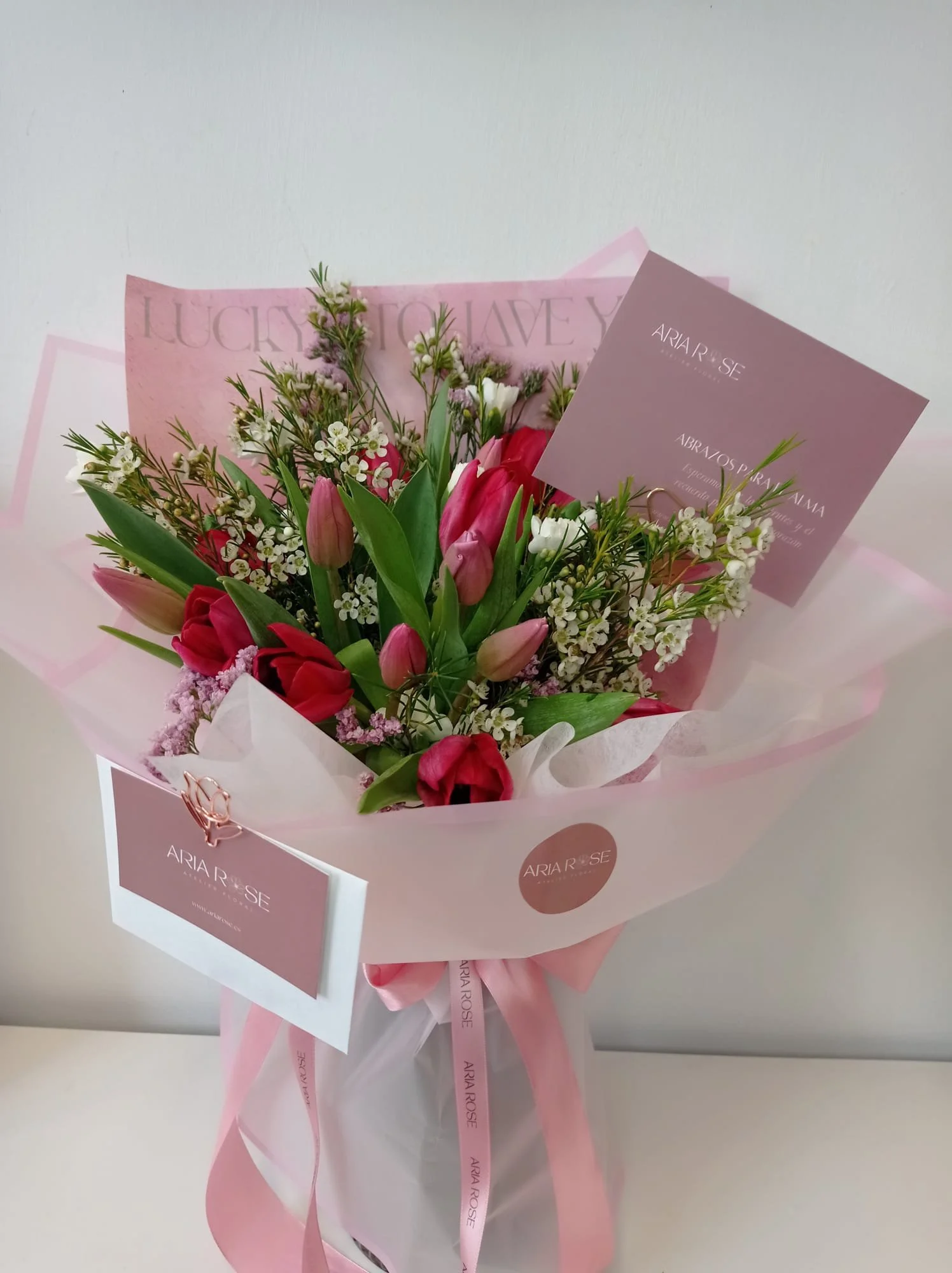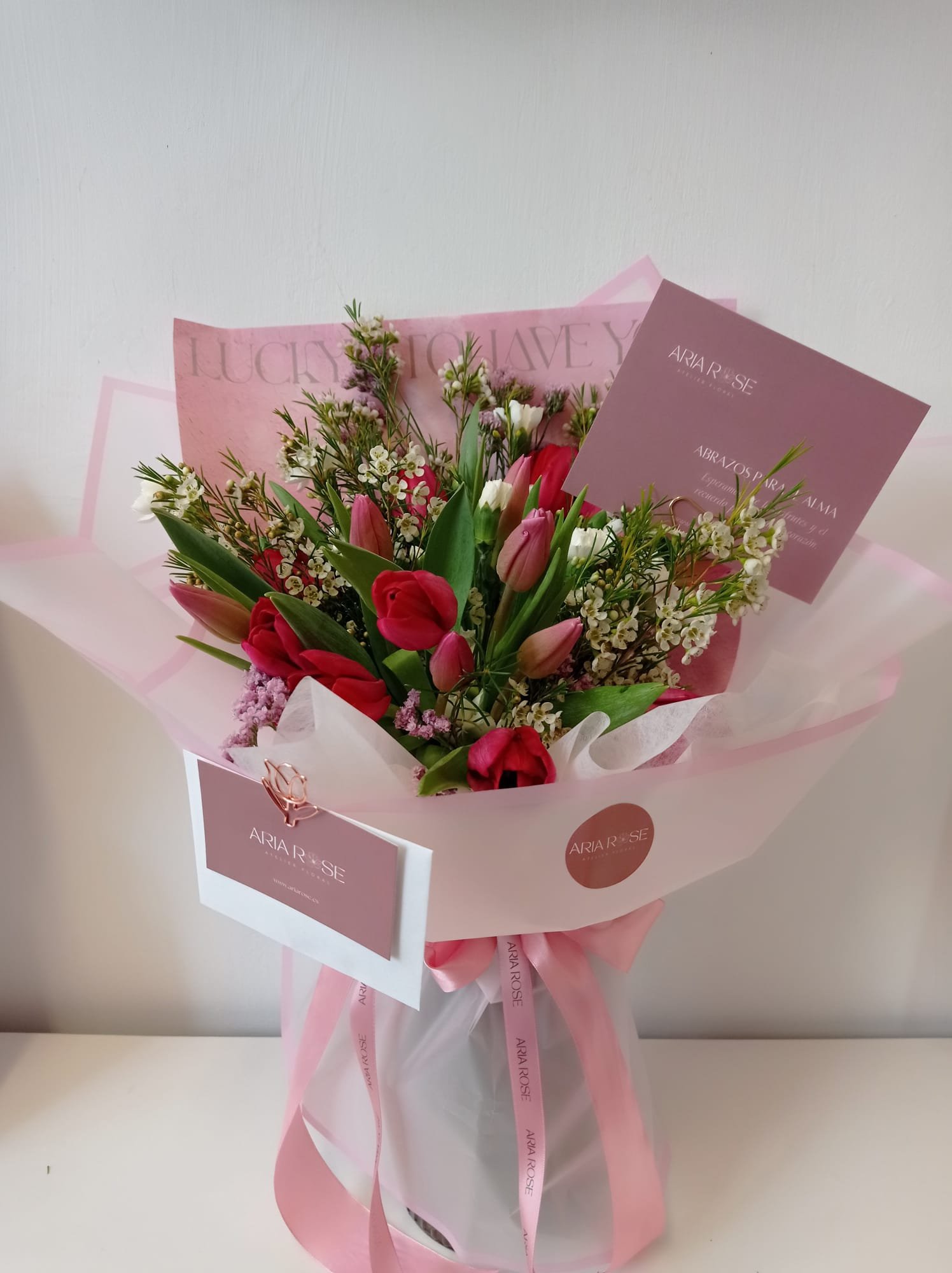Cada ramo es preparado con dedicación en el taller Aria Rose, cuidadosamente envuelto con papel traslúcido, cintas de satén y una presentación impecable que refleja el mimo en cada detalle.
