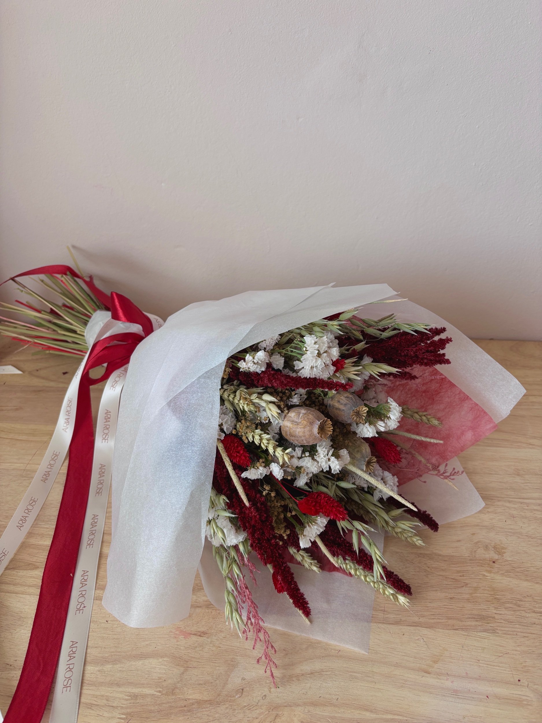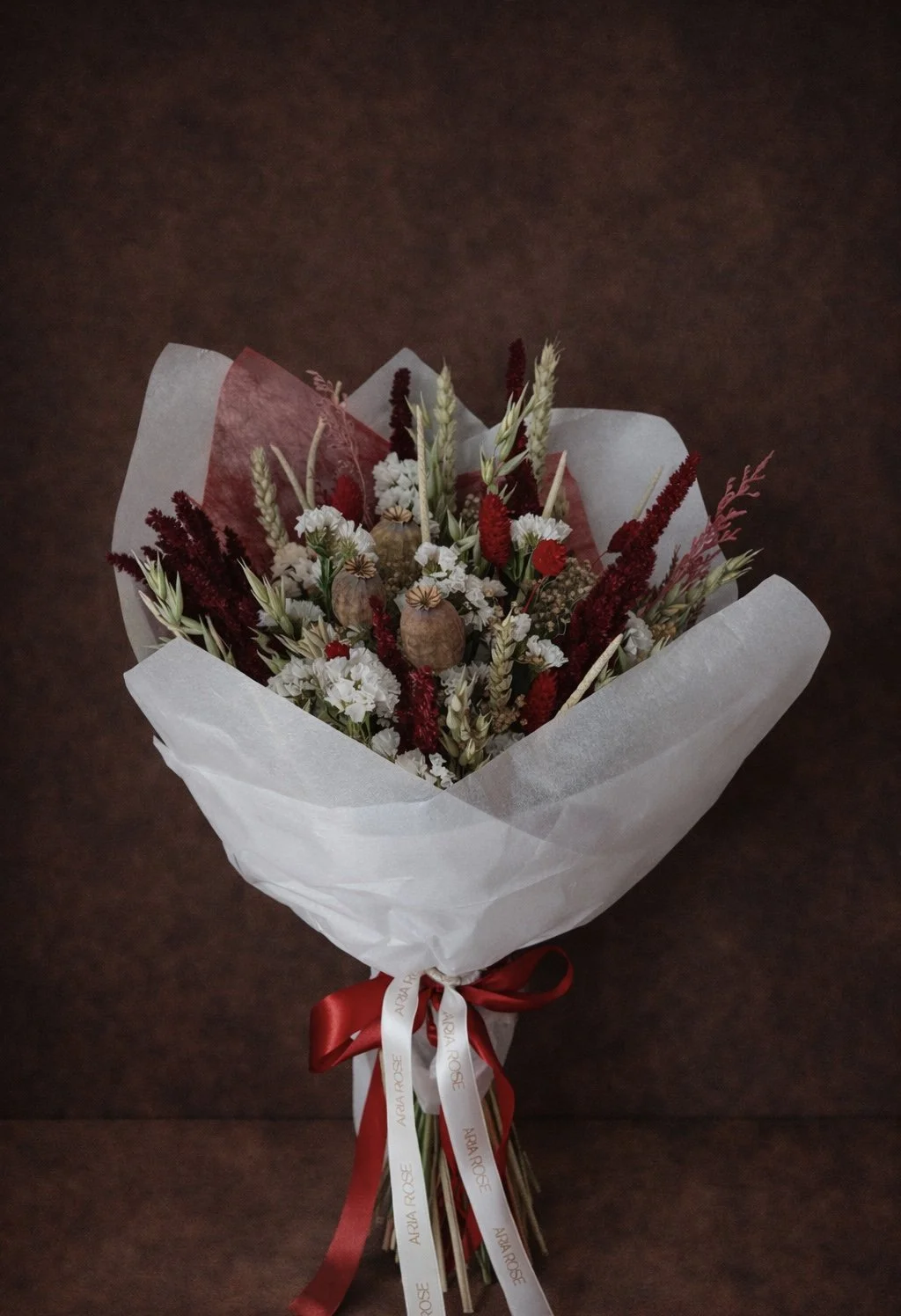 Flores secas y preservadas en tonos profundos y elegantes, diseñadas como una obra floral que no se marchita y no se olvida.