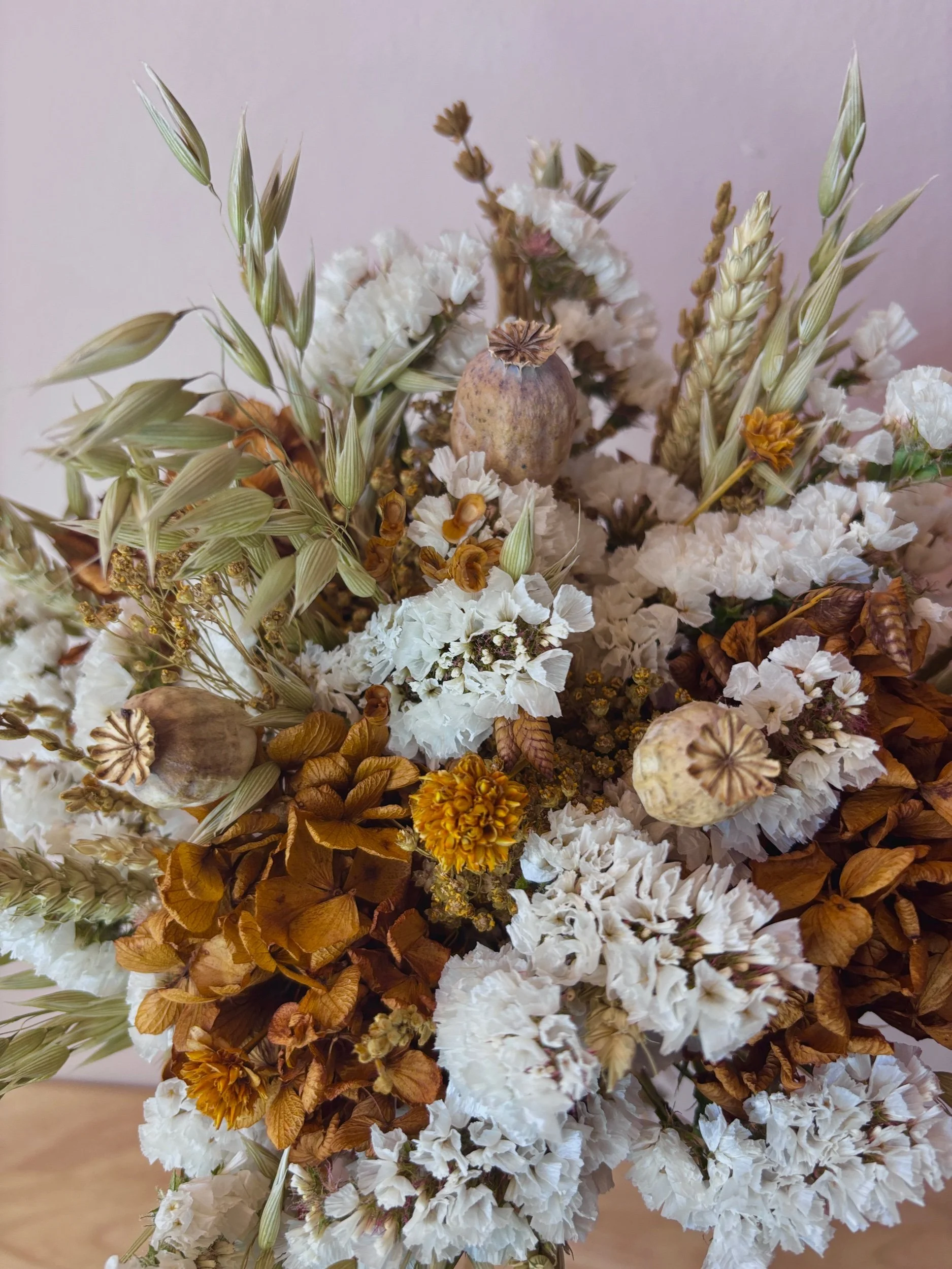 Las texturas suaves de las siemprevivas blancas se entrelazan con hortensias preservadas en tonos miel, espigas y pequeñas cápsulas naturales que aportan carácter y profundidad. El resultado es un ramo atemporal que no necesita agua, pero sí un lugar especial donde respirar.